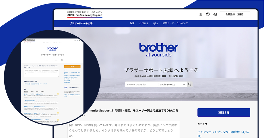 ブラザー販売ではユーザーサポートに外部サービスを活用する先進的な取り組みとして2013年から『OKBIZ. CS』を基盤としたサポートコミュニティ「ブラザーサポート広場」を開設してきました。このたびの「ブラザーサポート広場」のデザインカスタマイズは、サポートサイトから「ブラザーサポート広場」に遷移した際に、ブラザー販売の世界観を反映したサイトデザインをユーザーに提供することで、今まで以上に安心して利用いただくことを目的とし、今回のデザインカスタマイズへと至りました。