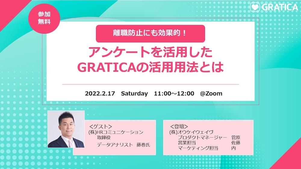 互い助け合いをベースとした法人・個人向け製品サービスを展開する株式会社オウケイウェイヴ(所在地:東京都港区、代表取締役社長:福田 道夫、以下「オウケイウェイヴ」)は、株式会社HRコミュニケーション(所在地:東京都千代田区、代表取締役:佐々木 真直、以下「HRコミュニケーション」)と無料オンラインセミナー(以下「本オンラインセミナー」)「離職防止にも効果的!アンケートを活用したGRATICAの活用方法とは」を開催します。