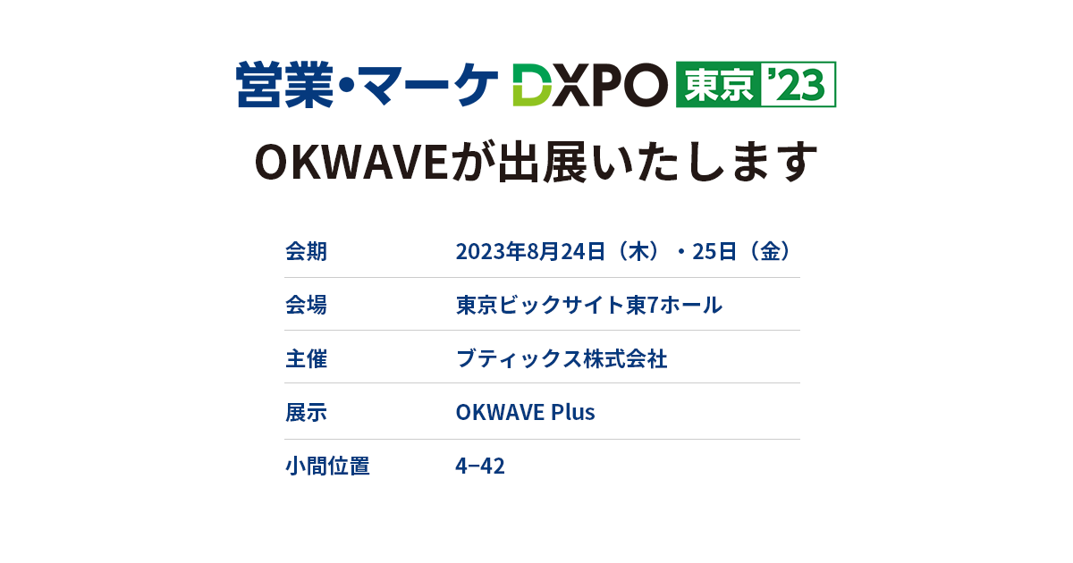 「世界中のありがとうの物語を蓄積し可視化する」をパーパスとし、法人・個人向け製品サービスを展開する株式会社オウケイウェイヴ(所在地:東京都渋谷区、代表取締役:杉浦 元、以下「オウケイウェイヴ」)が運営する『OKWAVE Plus』が、2023年8月24日(木)~2023年8月25日(金)にブティックス株式会社が主催する「営業・マーケ/広告・販促/店舗・EC DXPO東京’23」に出展いたします。