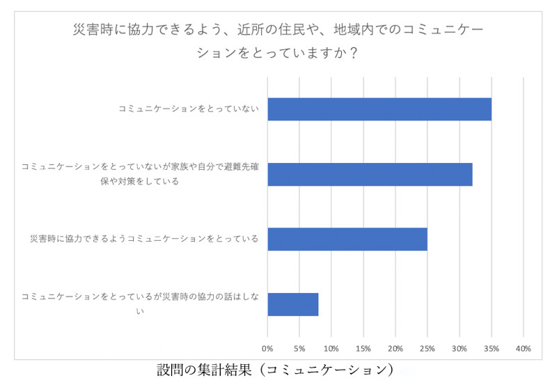 ・「災害時に協力できるよう、近所の住民や、地域内でのコミュニケーションをとっていますか」という設問に対し、「コミュニケーションをとっていない」回答が35%と最多となり、「コミュニケーションをとっている」回答25%を上回った。