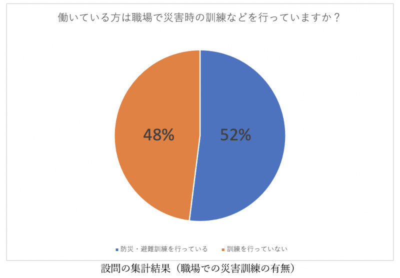 ・「働いている方は職場で災害時の訓練などを行っていますか」という設問に対し、「訓練している」が52%、「訓練していない」が48%と、やや「訓練している」が上回る結果となった。