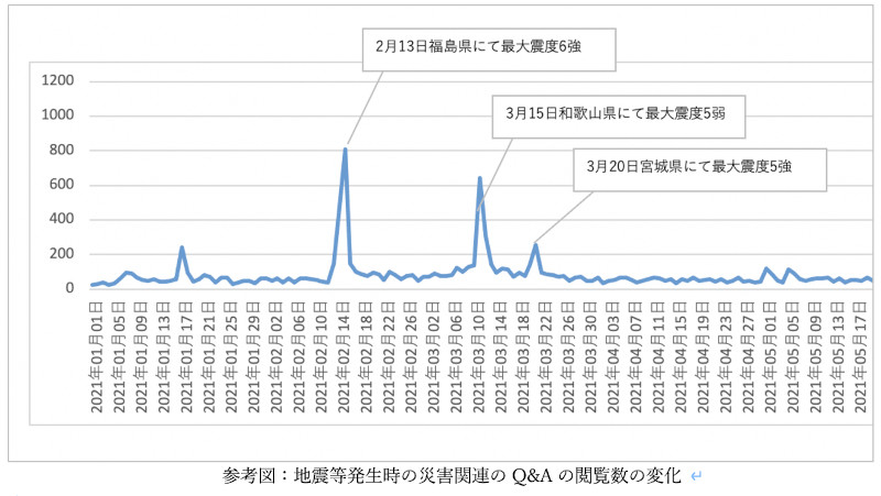 災害時には、一人では対処が難しいことも多くあり、近所の人と協力し合う必要が出てくる場面も想定されます。Q&Aコミュニティサイト「OKWAVE」の過去1年間のユーザーの利用動向を見ると、国内外での大地震発生の際には地震や災害に関するQ&Aコンテンツが通常よりも多く見られる傾向があり、災害時・防災のリファレンス先の一つとして利用されている傾向が伺えます(参考図1)。