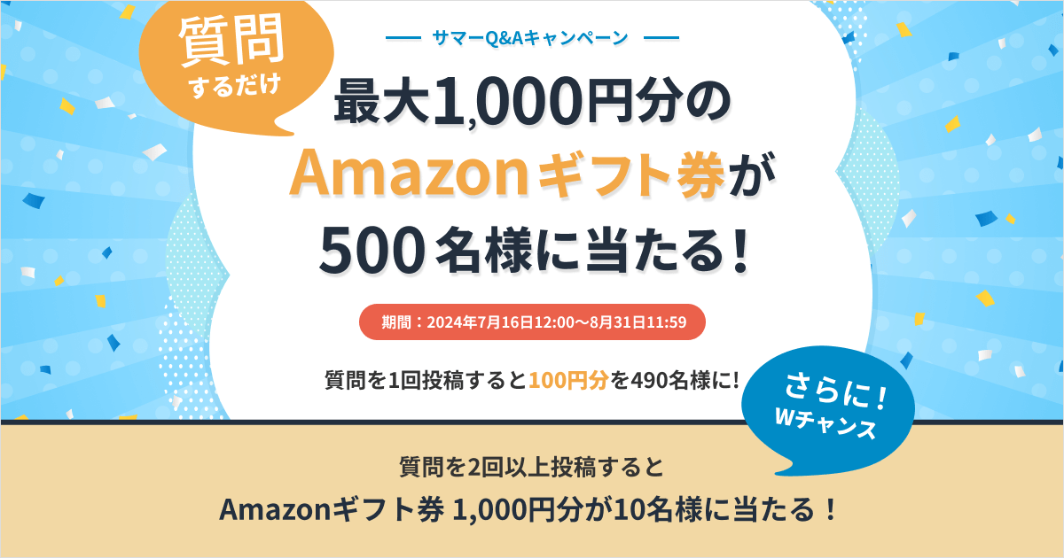 | 賞品一覧: | 期間中に質問を1回投稿した方の中から抽選で490名様に100円分のAmazonギフト券
