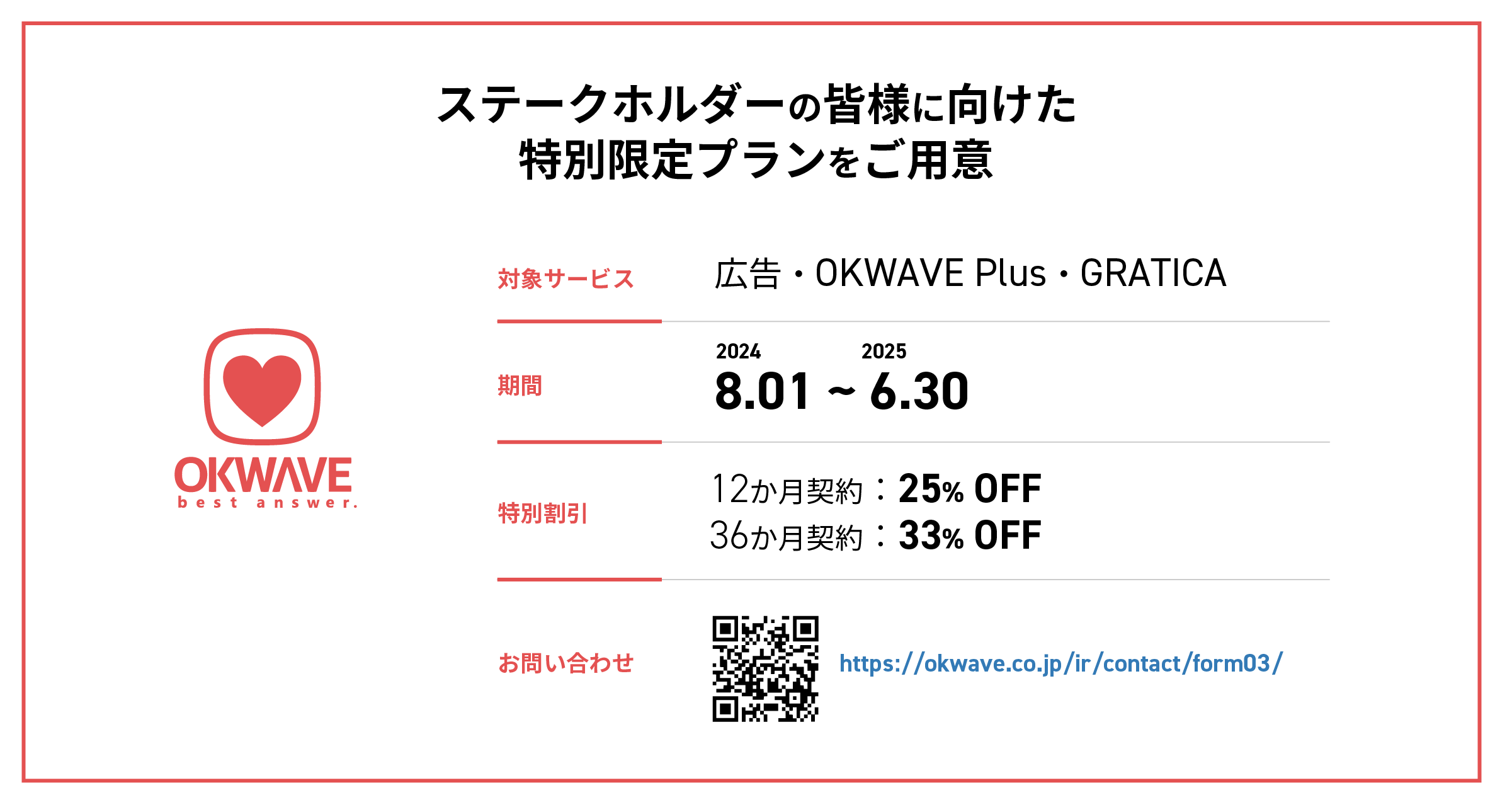 | お問い合わせ | https://okwave.co.jp/ir/contact/form03/ |
