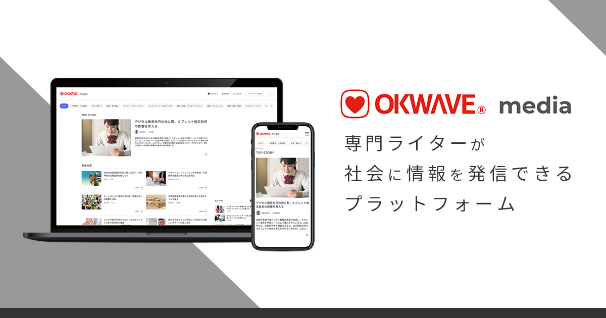 Q&Aコミュニティ「OKWAVE」では、旬な話題や、社会情勢などを反映した質問や相談、悩みも多く含まれ、それらに回答が寄せられることで「ありがとう」が生まれています。一方で、世の中にはまだ知られていない「ありがとうが生まれるストーリー」が数多く眠っています。そこで、オウケイウェイヴは、こうした現場のリアルや役立つ情報を広く社会に届けたいと思い、『OKWAVE media』を立ち上げました。