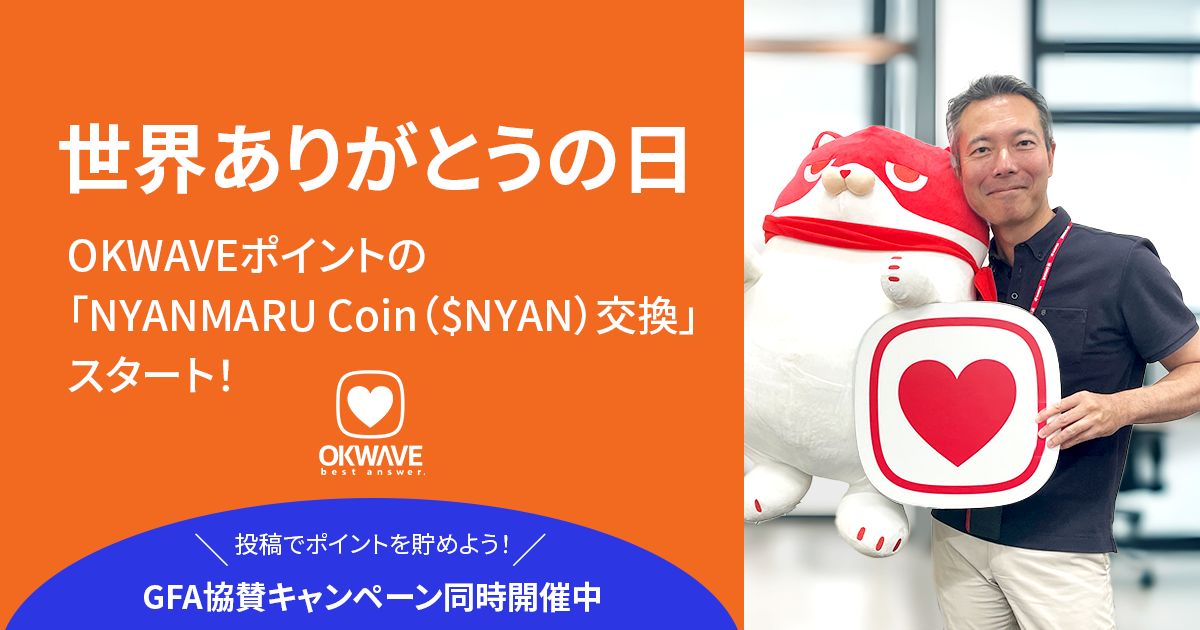 「世界中のありがとうの物語を蓄積し可視化する」をパーパスとし、法人・個人向けコミュニティサービスを展開する株式会社オウケイウェイヴ(本社所在地:東京都港区、代表取締役:杉浦 元、以下「オウケイウェイヴ」)は、2025年7月15日の「世界ありがとうの日」にあわせて、運営するQ&Aコミュニティ『OKWAVE』において、暗号資産「NYANMARU Coin($NYAN)」とのポイント交換機能を実装し、同日よりGFA株式会社(東京都港区、代表取締役:松田 元、以下「GFA」)協賛の期間限定キャンペーンを開始します。