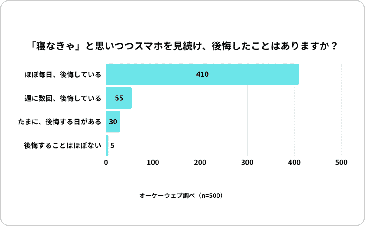 【課題】「寝る前スマホ」に対し、82.1%が「罪悪感」や「後悔」を感じている。