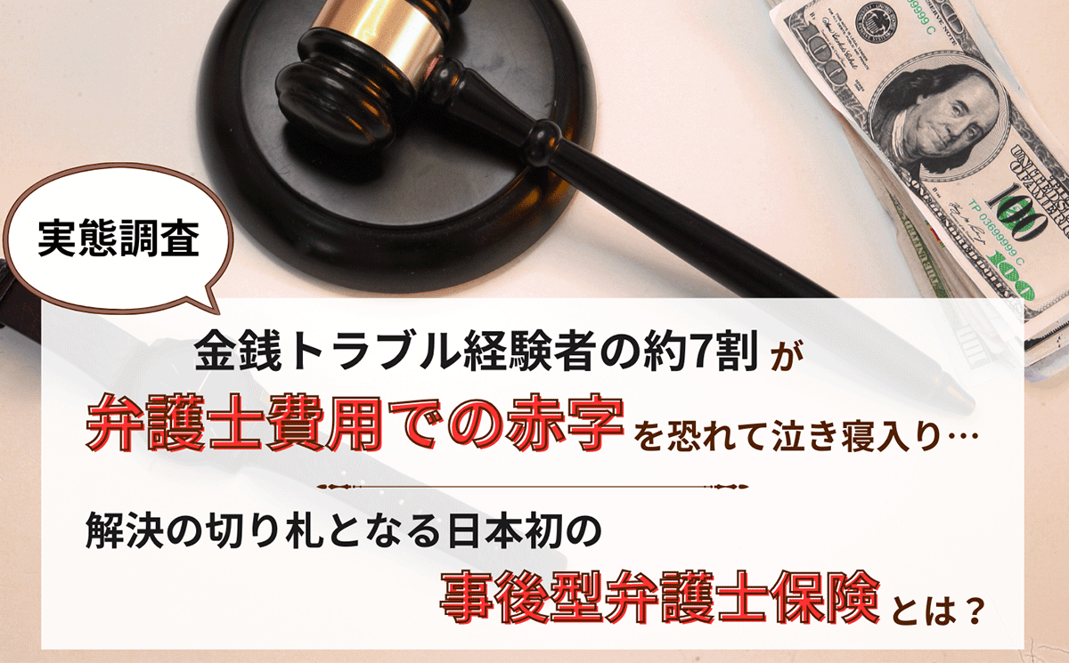 【実態調査】金銭トラブル経験者の約7割が「弁護士費用での赤字(費用倒れ)」を恐れて泣き寝入り。潜在ニーズ86%を誇る、解決の切り札となる日本初の「事後型弁護士保険」とは?