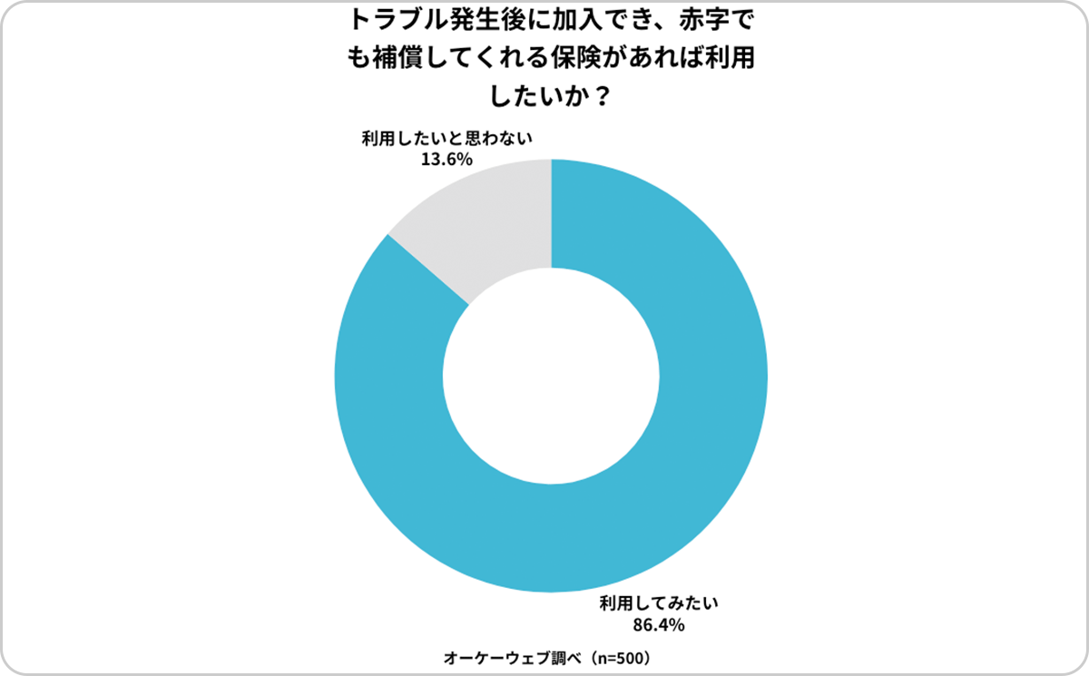 「勝訴しても相手が支払わず逃げてしまい、弁護士費用だけが残る赤字リスク」を55.2%の人が認知しているなか、「もしトラブル発生後に加入でき、赤字になった場合にマイナス分を補償してくれる保険があれば利用したいか?」という問いに対し、全体の86.4%(432名)が「利用してみたい(はい)」と回答しました。