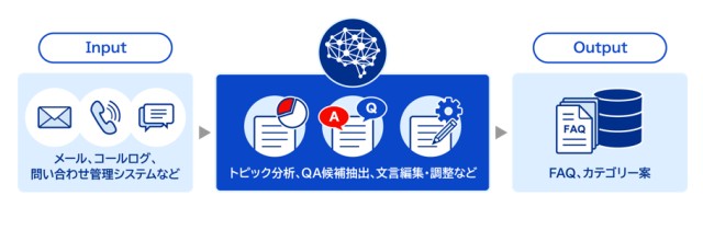 ※1 テストケースでは約2万件のメールデータをAI分析により問い合わせ傾向を分析し、満遍なく情報をピックアップし、約400件のFAQをAIが作成。目視によりFAQの内容を最終調整し公開するまでの期間は約1ヶ月。メールデータを1件ずつ目視確認しFAQを作成した場合には5ヶ月程度かかる試算であるため、工数の80%効率化をAIが実現しています。