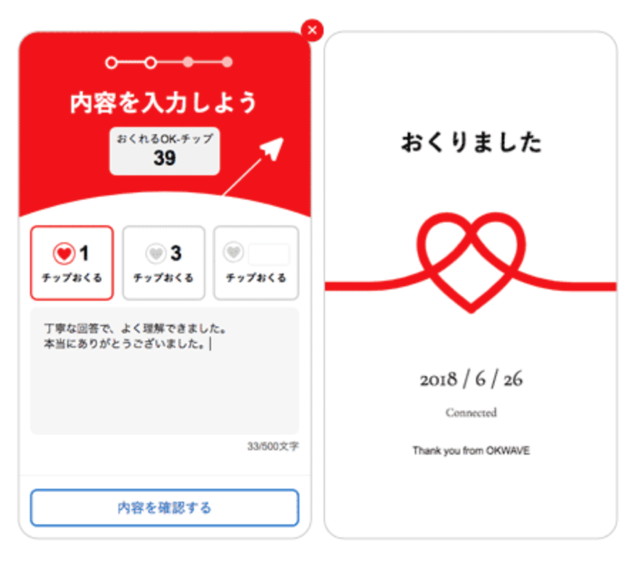 日本初、最大級のQ&Aサイト「OKWAVE」を運営する株式会社オウケイウェイヴ(本社:東京都渋谷区、代表取締役社長:兼元 謙任)は、良いことをした人がより報われるような新しい経済圏「感謝経済」プラットフォームの構築を進めており、2018年6月26日より感謝の気持ちとともに贈り合えるサイト内トークン『OK-チップ』の提供を開始しました。