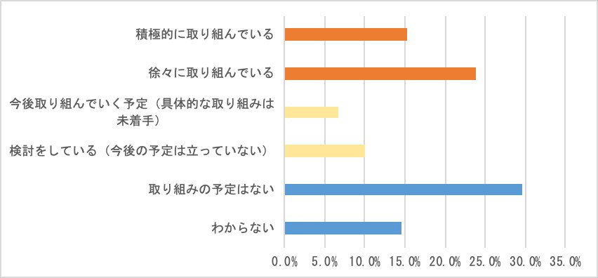 アンケート調査では、自分の勤め先が「働き方改革に既に取り組んでいる」とする回答は39%。一方で「取り組みの予定はない」の回答も29.6%と、三割弱にのぼりました。