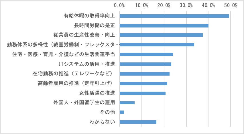 また、「改革実現に必要だと思う要素」について、昨今注目を集める「女性活躍の推進」の回答は20.6%、さらに、2018年秋の臨時国会で法律が成立した、いわゆる“外国人人材受け入れ拡大法”(正式名称:改正出入国管理法)などの議論がなされていた期間中に本調査を実施しましたが、「外国人・外国留学生の雇用」は6.9%の回答に留まる結果となりました。