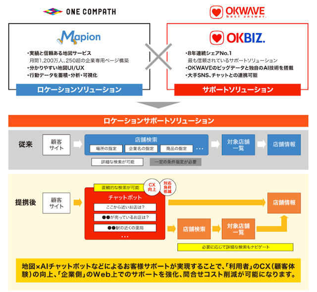 Q&Aサイト「OKWAVE」の運営ならびにFAQシステム等を提供する株式会社オウケイウェイヴ(本社:東京都渋谷区、代表取締役社長:松田 元)と、地図検索サービス「Mapion」を運営する、凸版印刷株式会社のグループ会社である株式会社ONE COMPATH(ワン・コンパス、本社:東京都港区、代表取締役社長CEO:早川 礼、以下、ONE COMPATH※1)は協業を開始します。