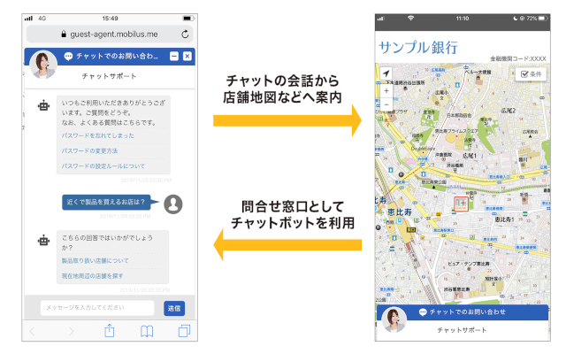 例えば、地図×AIチャットボットの連携では、お客様はコールセンターに電話することなく、AIチャットボットで最寄りの店舗を探したり、店舗の疑問点を来店前にチャットボットで解消したりできます。お客様の来店促進にも繋げられるほか、これまでコールセンターなどで対応してきた問い合わせ業務の負荷軽減に貢献できます。