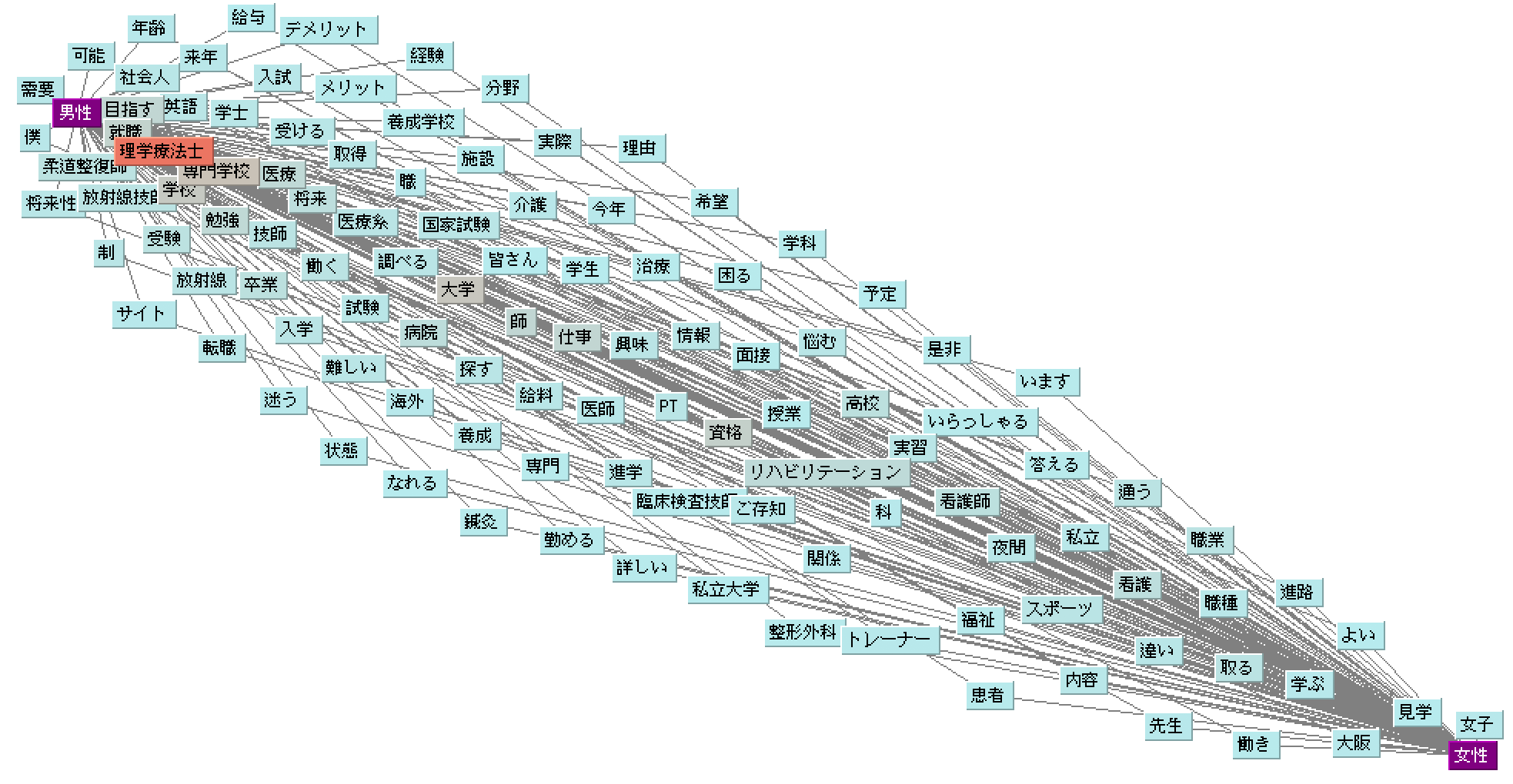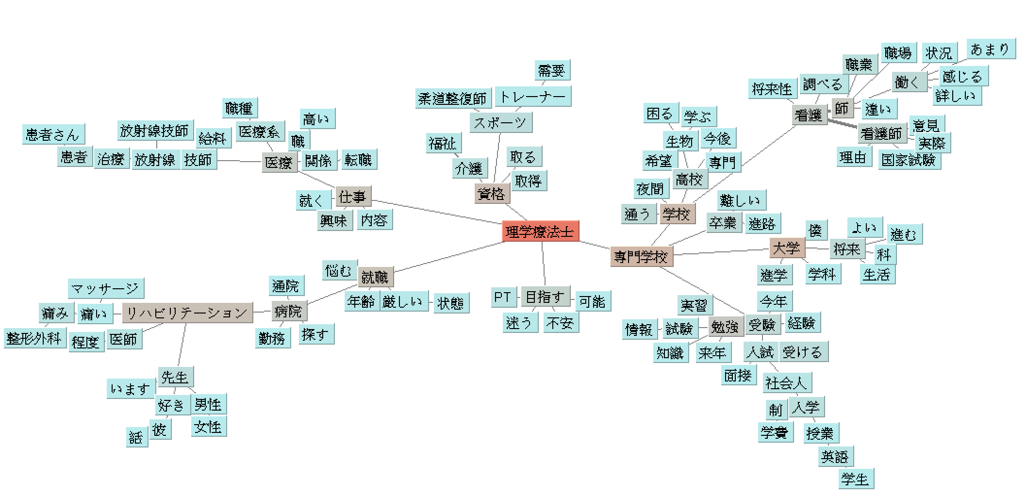 質問内容については、『理学療法士』に紐付いて頻出するワードを抽出したキーワードマップ(図1)をもとに大別すると、「仕事」「資格」「学校」といったワードの頻出頻度がとくに多いことからそれらを総じて【進路】、その他には「好き」「彼」といったワードから想起される【患者と理学療法士との人間関係】に分けられました。