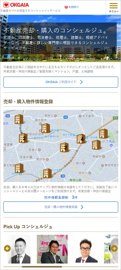 『OKGAIA』は売買物件の情報登録をベースとした、不動産業の専門家に相談できるコンシェルジュサービスです。物件の売却、購入の検討をする生活者と、宅建士、行政書士、司法書士、相続アドバイザー、税理士など不動産業に携わる専門家をマッチングし、生活者の不動産売買への不安や疑問を払拭し、安心してより良い不動産売買ができる場を提供します。