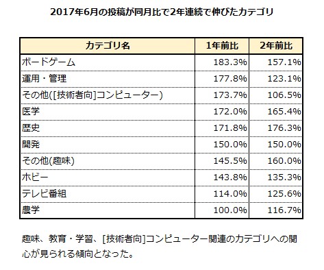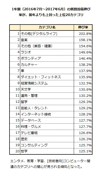 「教育・学習」「趣味・娯楽・エンターテイメント」「技術者向けコンピューター」「美容・健康」領域の質問投稿が増加