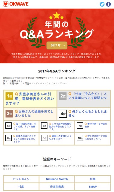 日本初、最大級のQ&Aサイト「OKWAVE」を運営する株式会社オウケイウェイヴ(本社:東京都渋谷区、代表取締役社長:兼元 謙任)は、3,600万件以上に及ぶ「OKWAVE」のQ&Aコンテンツの年間閲覧数ランキングとサイト内検索数が短期間に急上昇した話題のキーワードを集計した『年間のQ&Aランキング』を2017年12月20日に発表しました。