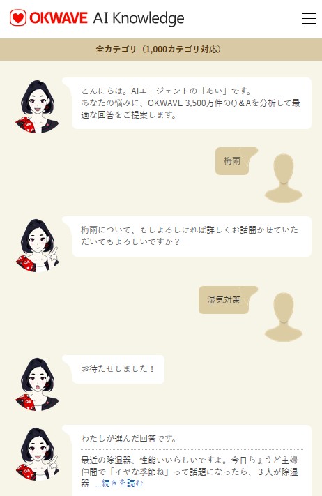 また、同日より、Q&Aサイト「OKWAVE」上では、これまで多くの方に親しまれてきたAIエージェント「あい」をバージョンアップしました。より親しみやすく生まれ変わったAIエージェント「あい」が利用者からのあらゆる質問に感情豊かに回答します。