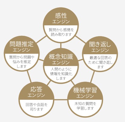 あらゆる質問に最適な回答を提示するため、AIエージェントはその頭脳として、当社独自開発の「知識概念エンジン」「問題推定エンジン」「応答エンジン」「聞き返しエンジン」「感性エンジン」「機械学習エンジン」を搭載しています。
